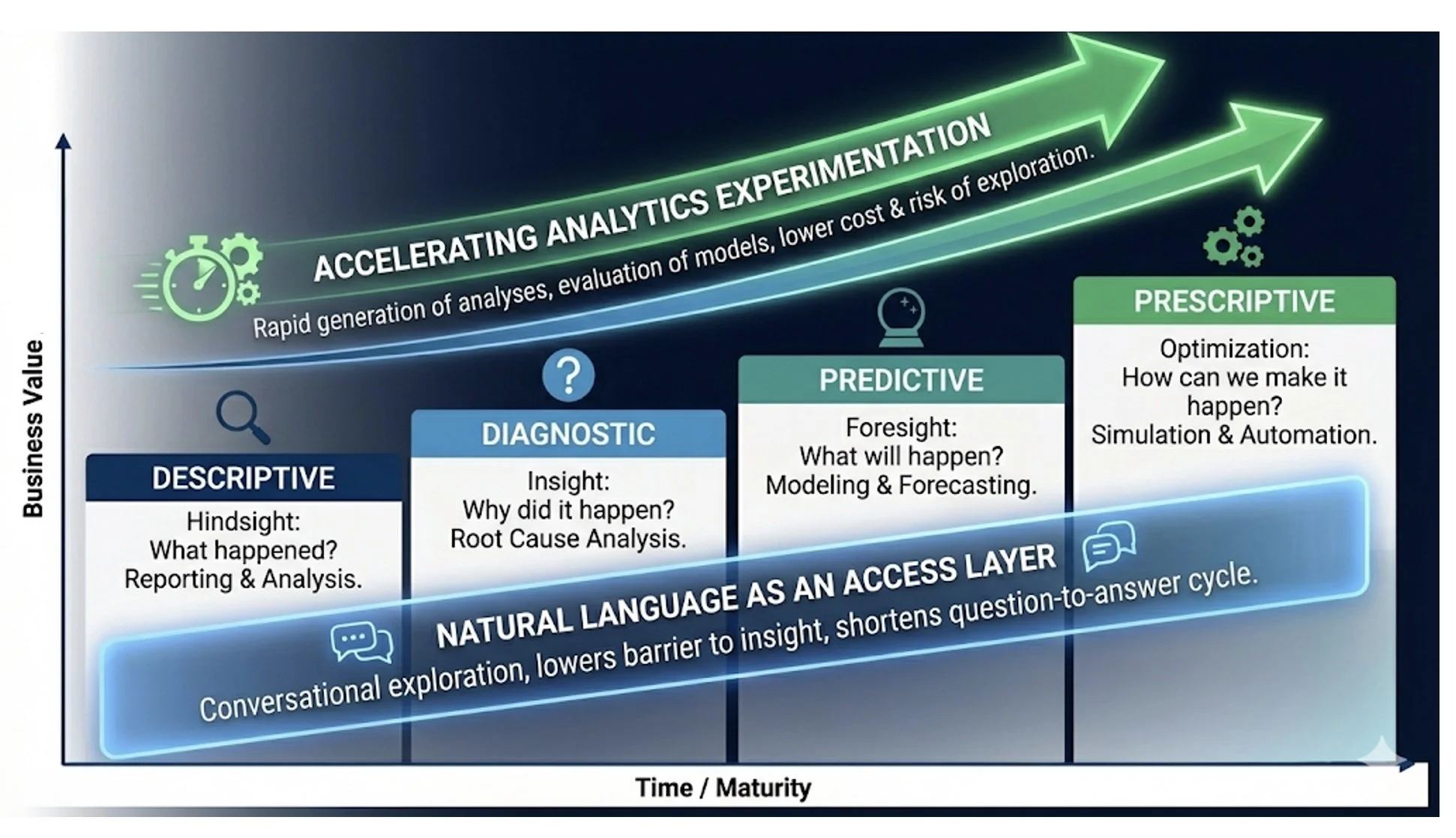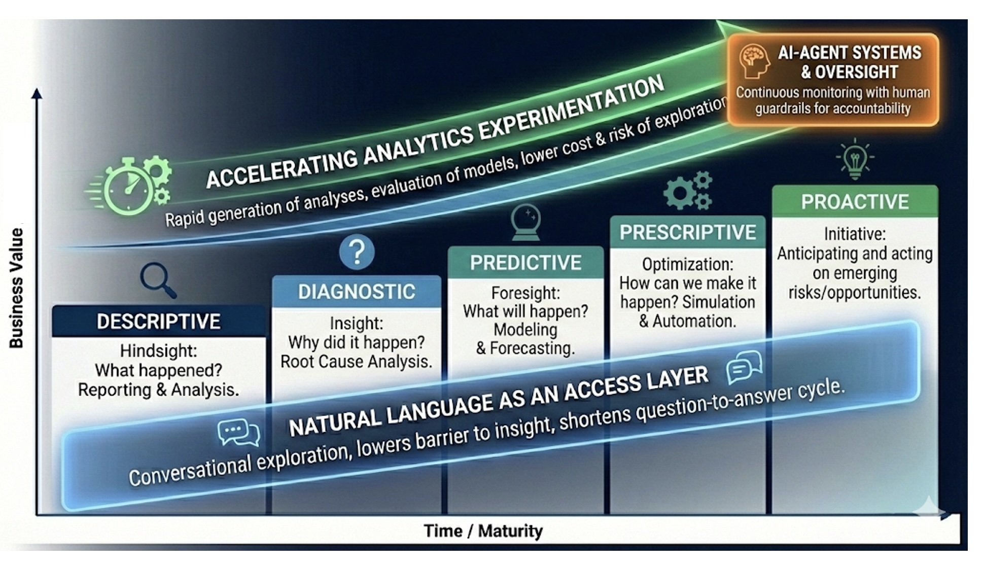 The analytics maturity model remains a useful way to describe how organizations develop analytical capabilities. What has changed is the pace and accessibility of the journey. Generative AI reduces friction across analytics workflows, allowing organizations to unlock value earlier through natural language access, faster experimentation, and richer context.