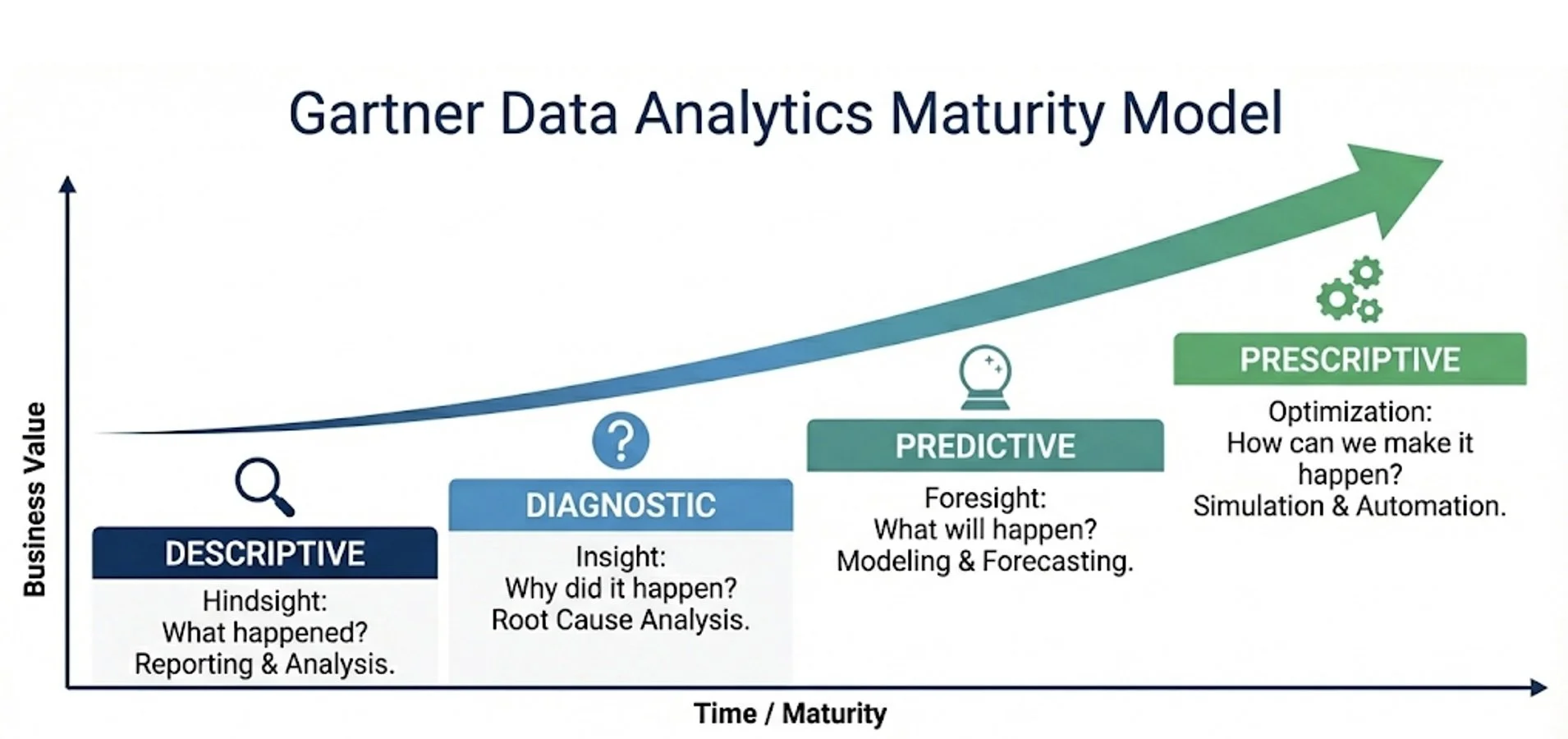 The analytics maturity model emerged to describe how organizations typically develop analytical capabilities over time. While variations exist, most formulations converge on a common progression that reflects increasing sophistication in how data is used to support decision-making.