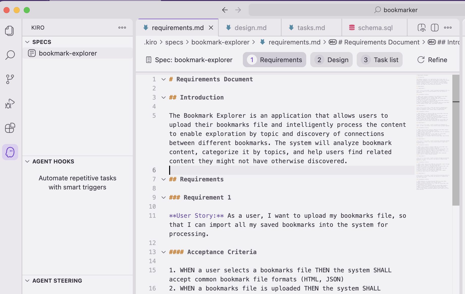 So I went through the steps to create a generic bookmark manager, the kind of demonstration you see in YouTube coding agent demos. Kiro helped me write the requirements document (which it calls a ’spec’). Then, and only when I was done with that, it guided me to create a technical design. That you are told to finish each step before proceeding is the clincher that this flow is based on waterfall ideas, though that unpopular word is, of course, used nowhere in Kiro.