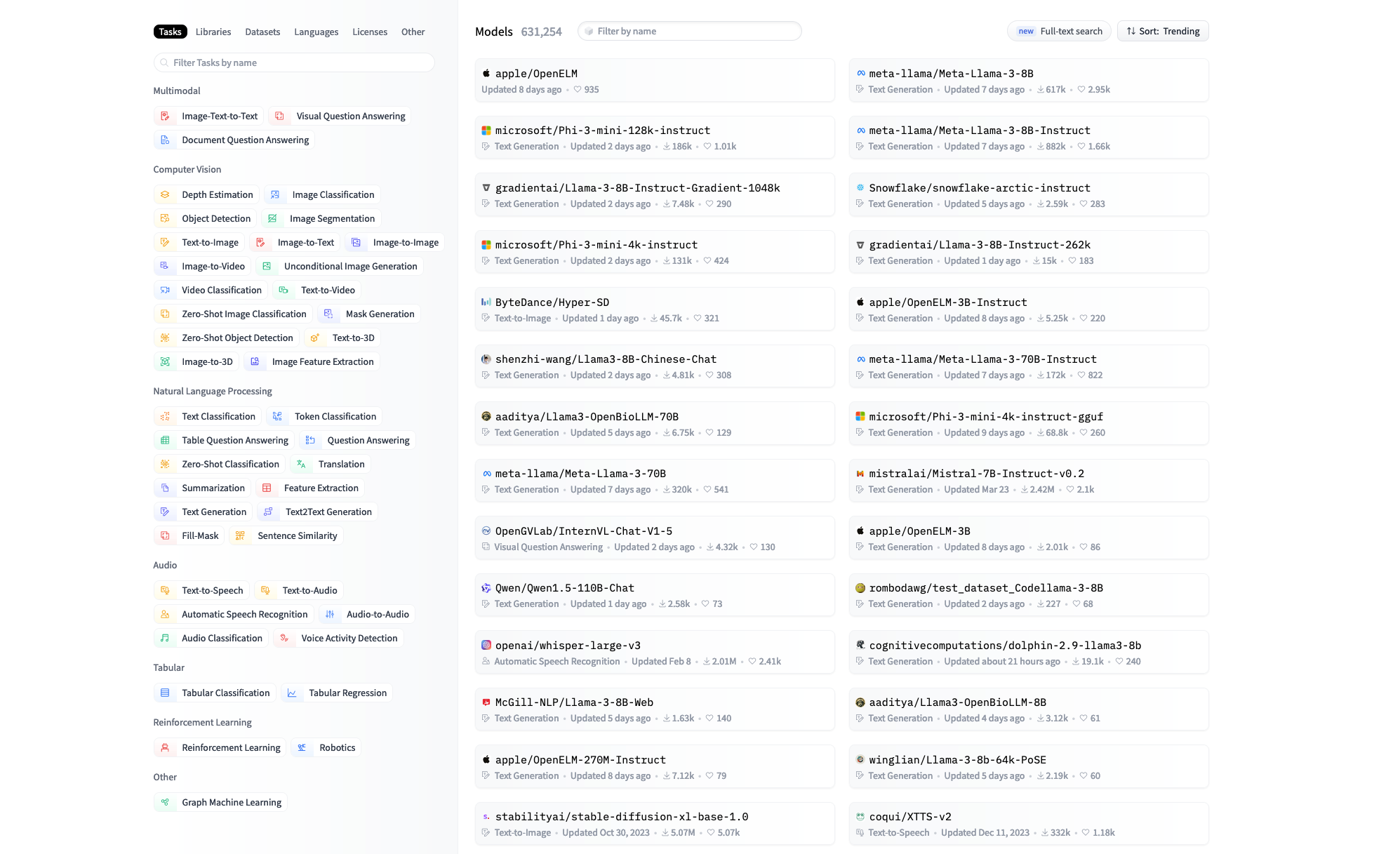 There are now many websites that show the breadth of offerings, such as on the model page of the AI community site Hugging Face, which shows not only great numbers, but many categories: